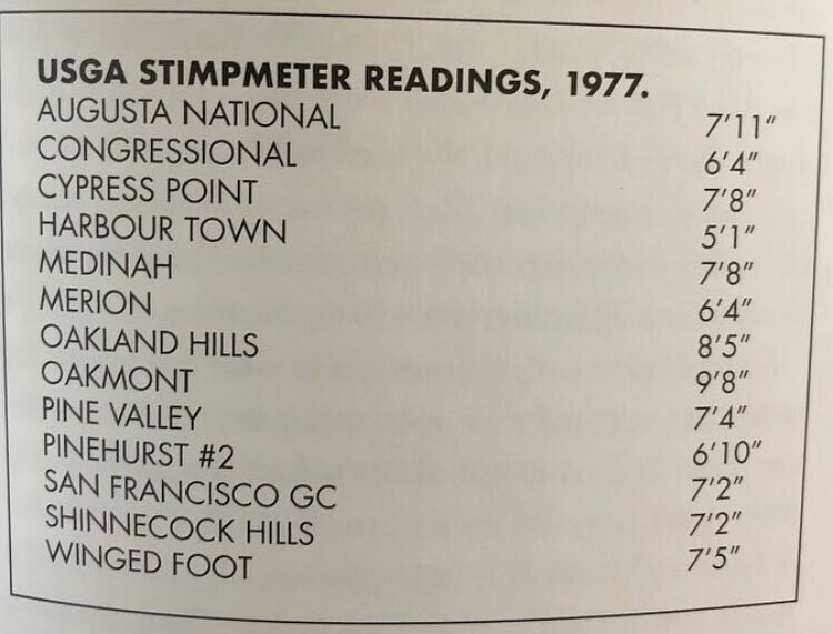 Found this pic of stimpmeter readings from 1977 for a bunch of courses everyone is probably familiar with. Very eye opening.