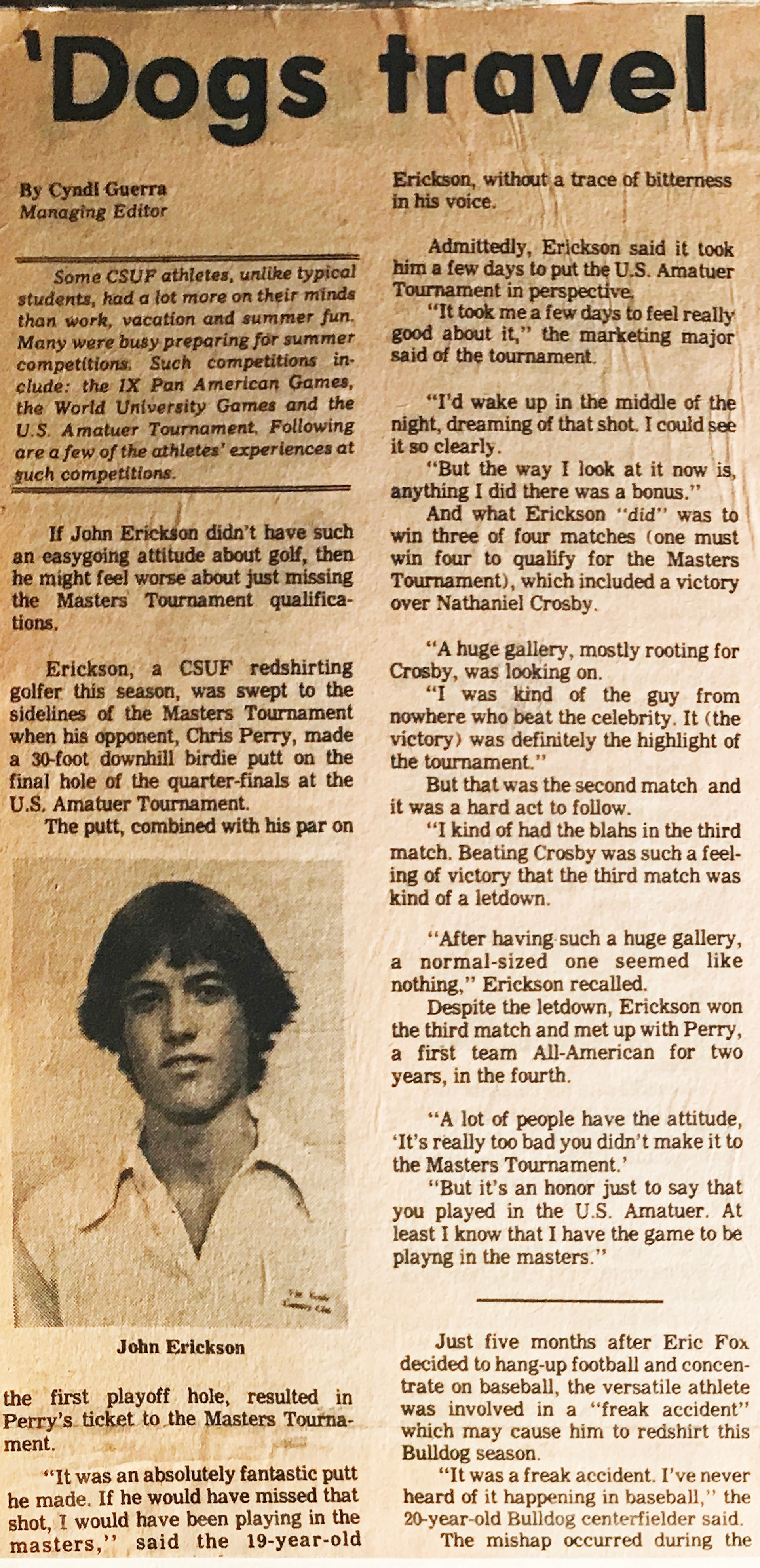 I remember being down at the FSU athletic press room for an interview after I came back from the US Amateur. It was quite a journey from qualifying in Hawaii at Waialae Country Club in Honolulu taking the 1 spot there away from the islanders. I won in sudden death playoff against Wendel Tom a Hawaiian native. I qualified in Chicago to get into the match play for the US Am… won my first match against Doug Doxie from Seattle, then beat Nathaniel Crosby who has won the US Am at Olympic Club in dramatic fashion. Then beat Billy Andrade before nearly winning against Chris Perry in the quarter finals. I was 1 up going into 18 after draining a 20 foot birdie on 17. Long par 4 and hit a 3 iron onto the green.. and make par. Perry is 25 feet above the hole, huge left to right putt coming straight down the hill and having to aim sideways. Just taps the ball and it’s rolling super slow. If it misses I win the match at get a ticket to play in the 1984 Masters. Regardless of the outcome, it was a big story back home about this 19 year old kid who almost pulled it off.